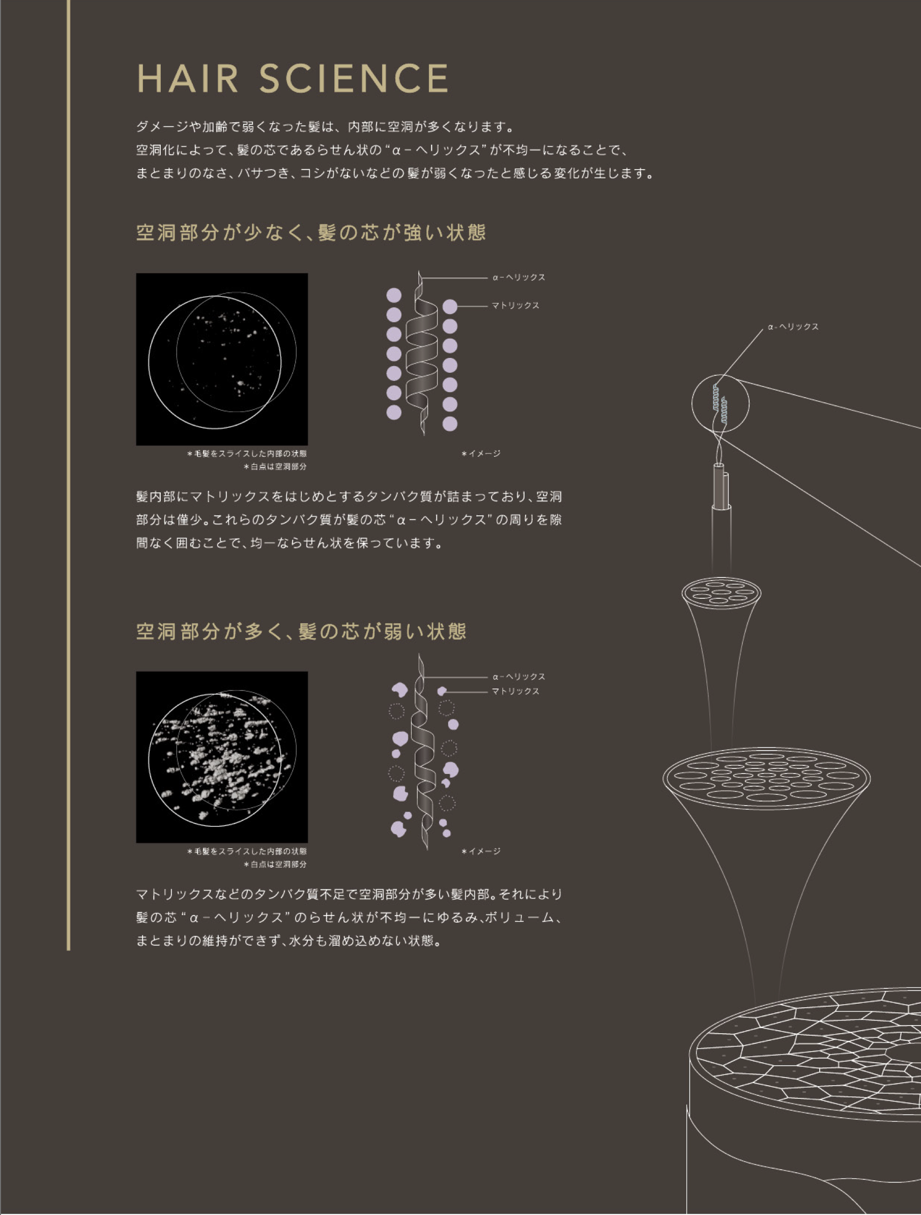 ダメージや加齢で弱くなった髪は、内部に空洞が多くなります。空洞化によって、髪の芯であるらせん状の“α―ヘリックス”が不均一になることで、まとまりのなさ、パサつき、コシがないなどの髪が弱くなったと感じる変化が生じます。