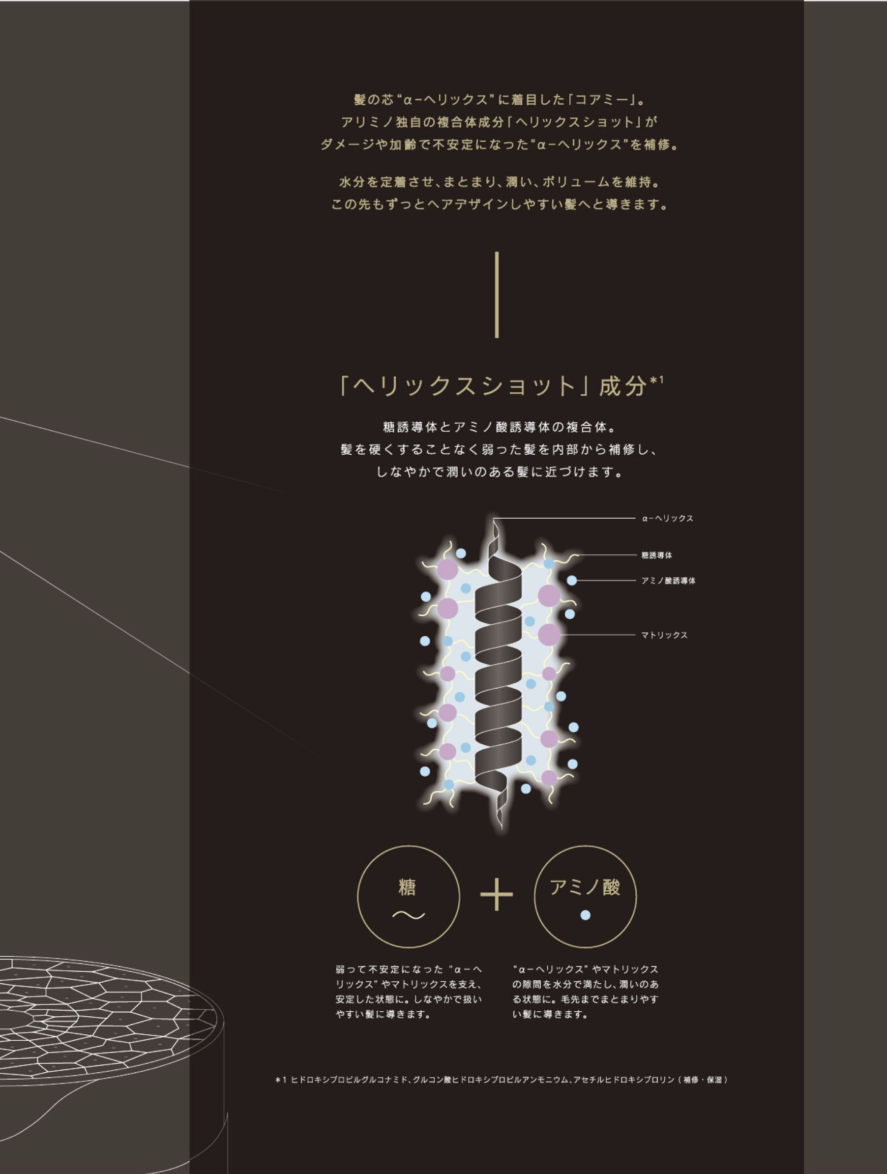 「コアミー」は髪の芯“α―ヘリックス”に着目。アリミノ独自の複合体成分「ヘリックスショット」がダメージや加齢で不安定になった“α―ヘリックス”を補修。